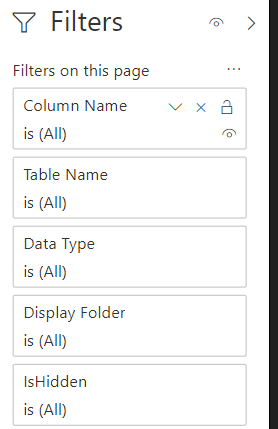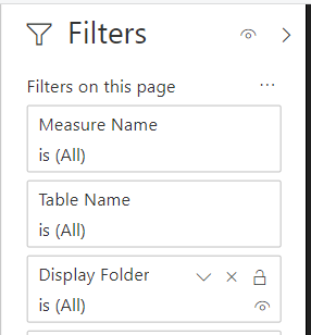 Navigation across the various report pages is handled via buttons linked to bookmarks, a fairly standard design in Power BI reports at this point. The report pages themselves are almost exclusively just table visuals with one row per item of the given database object. Rather than slicers, you can open the filter pane to make common selections such as the measures within a particular display folder.