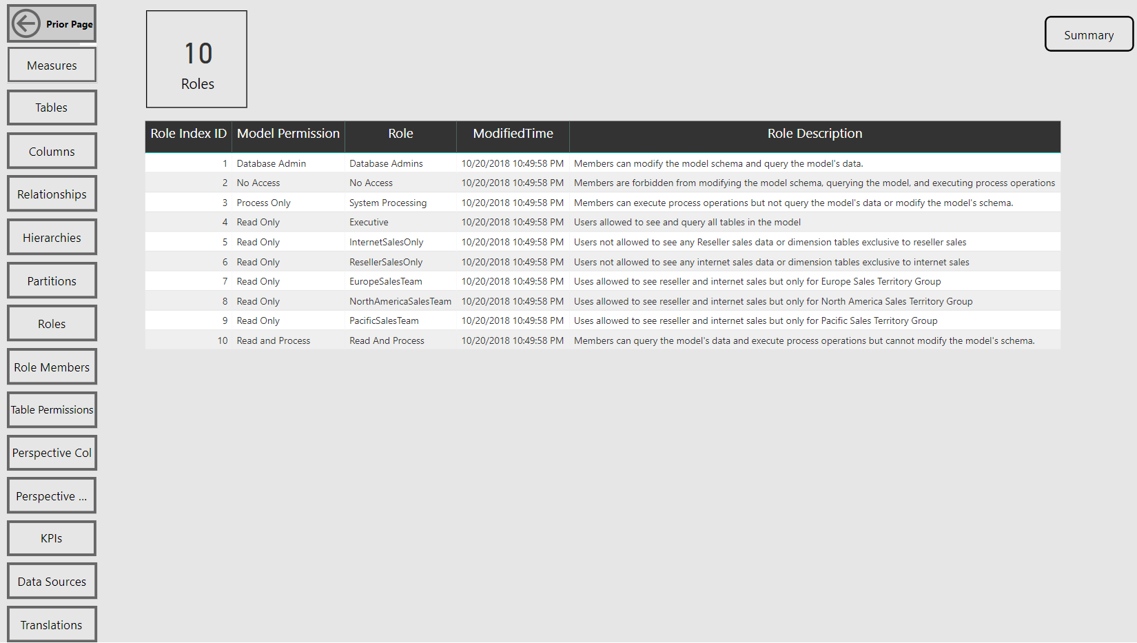 As its name implies, the tool is intended to deliver easy visibility to the schema and metadata of a Tabular model. For example, if you’re new to a particular model, you can very quickly get a sense for how large and complex the model is by the count of tables, measures, and the count of table rows. If you work with a particular Tabular model (or Power BI dataset) every day, and especially for larger models supporting multiple business areas, you may may find this tool much easier for looking up various details and in troubleshooting scenarios than clicking through the model authoring application (PBI Desktop or SSDT, generally).