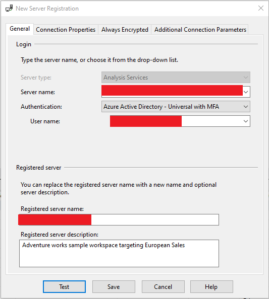 From the Analysis Services type (cube icon), you simply right-click the parent folder ‘Local Server Group’ to expose the ‘New Server Group’ and ‘New Server Registration’ options. Also advised in the MS Docs article, you should use Azure Active Directory – Universal with MFA as the authentication method when registering a server (or premium workspace in this case) per the following example: