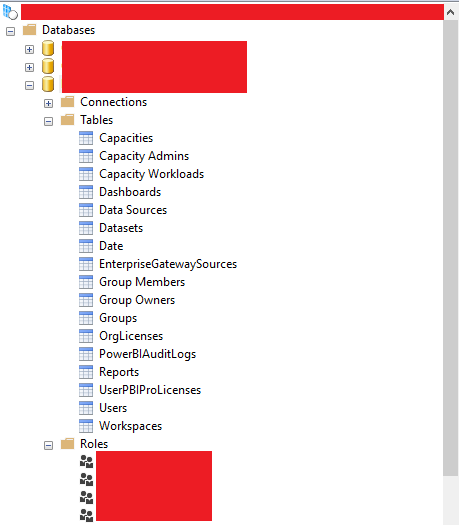 As another example, you could review the tables, row counts, and any Row-level security roles and their definitions built into the database. For the row counts, just right-click one of the tables to view the table partition(s) or write a simple DAX query against the dataset. The tables and roles metadata are exposed in SSMS like the following example: