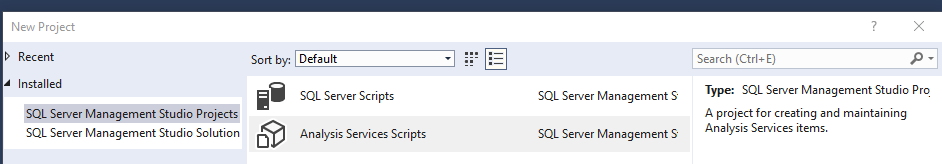 If you want to get started with Analysis Services Scripts projects for related DAX queries, TMSL processing/refresh scripts, etc you can launch the New Project dialog via the Ctrl+Shift+N keyboard shortcut or it’s just three clicks in SSMS (File-New-Project) to launch the New Project interface: