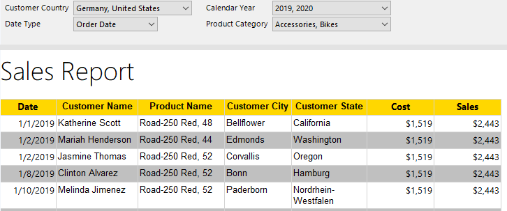 In the report above, the user has made selections on four parameters, three of which support multiple values. The Date Type parameter, which only accepts one value, is what makes this report a bit more dynamic than most paginated reports. Switching between Order Date, Ship Date, and Due Date would return different results based on these dates.