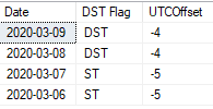 The above dataset retrieves just one row reflecting the current date’s UTC Offset. Technically the Date and DST Flag columns aren’t needed for this dataset. Also, as mentioned in prior posts, a stored procedure containing this query in the source database would be an even better option.